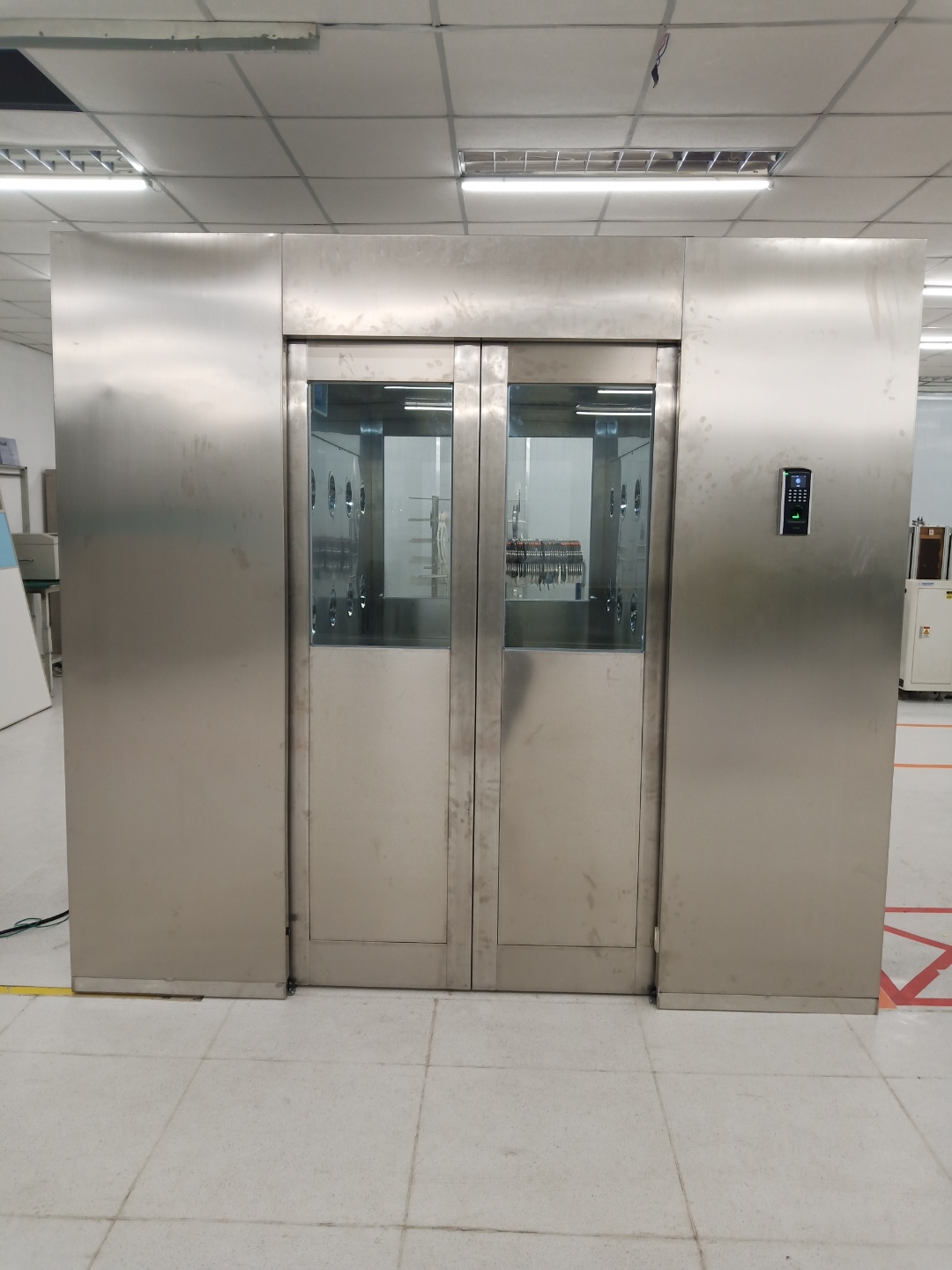 5、急停裝置:當風淋室出現(xiàn)故障的情況下,能迅速切斷電源,使風淋室所有的門處于打開狀態(tài),大限度地保障使用者的安全性。